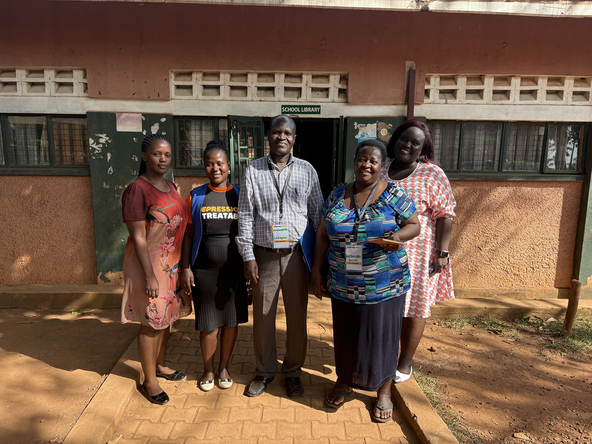 Photo Caption: Pictured from left to right, Sandra (StrongMinds), Abigail (StrongMinds Mental Health Coach), Senior Man Teacher and StrongMinds Facilitator Matambire Lookman, Senior Woman Teacher and StrongMinds Facilitator Sebuliba Alice, Charlotte Olayo (StrongMinds Deputy Country Director).